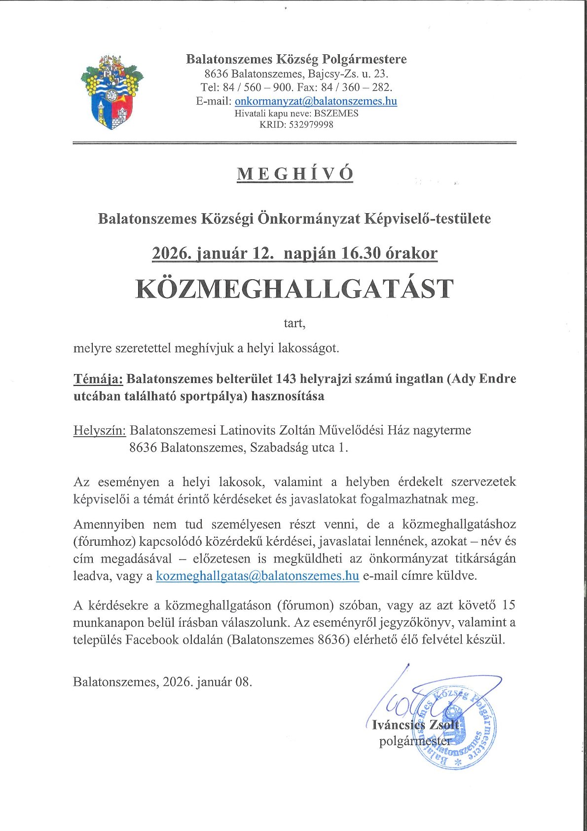 Balatonszemes Községi Önkormányzat Képviselő-testülete, közmeghallgatást tart